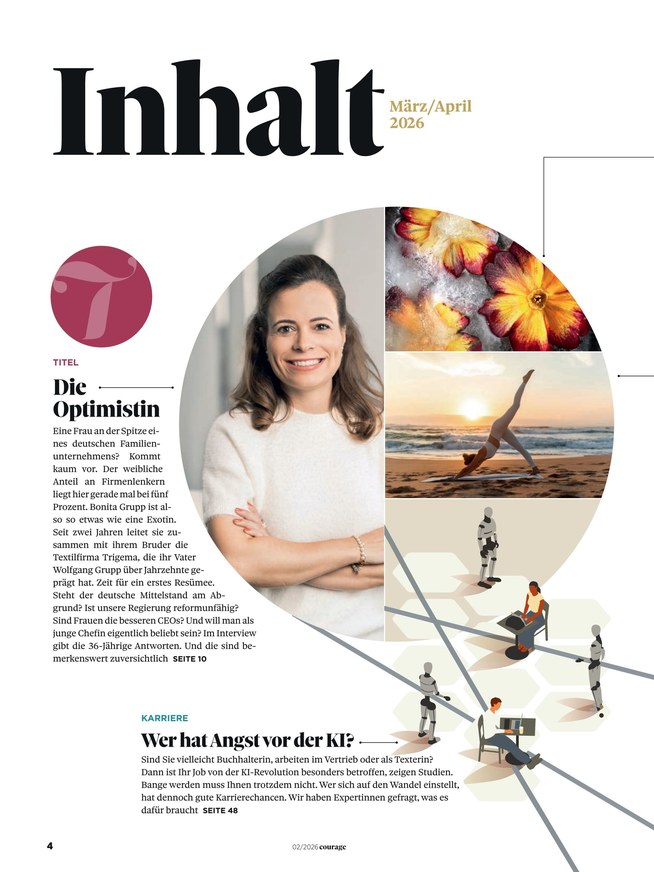Courage ist die erste Zeitschrift, die sich thematisch an Frauen richtet und die Themen Finanzen und Karriere beleuchtet. Sie erscheint in der Holderstock Media GmbH und bringt alle zwei Monate die Leserinnen und Leser dazu, gewohnte Muster zu hinterfragen und mutig zu sein. Weiterlesen...