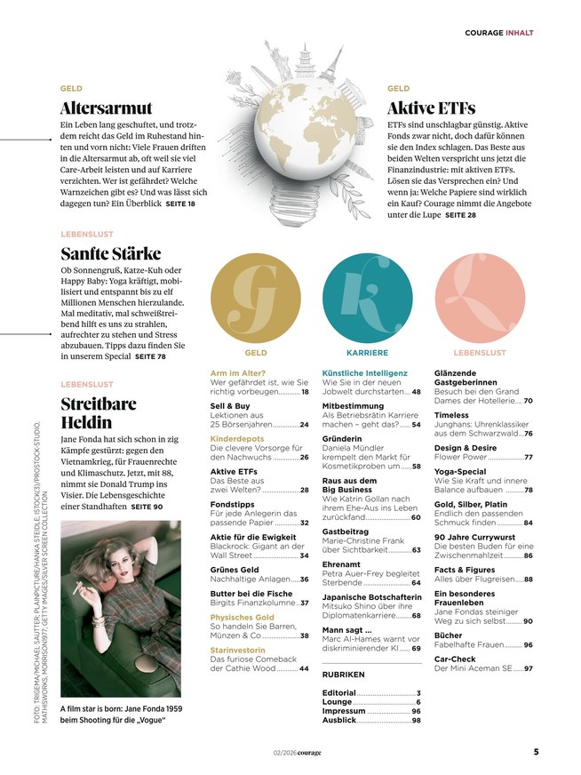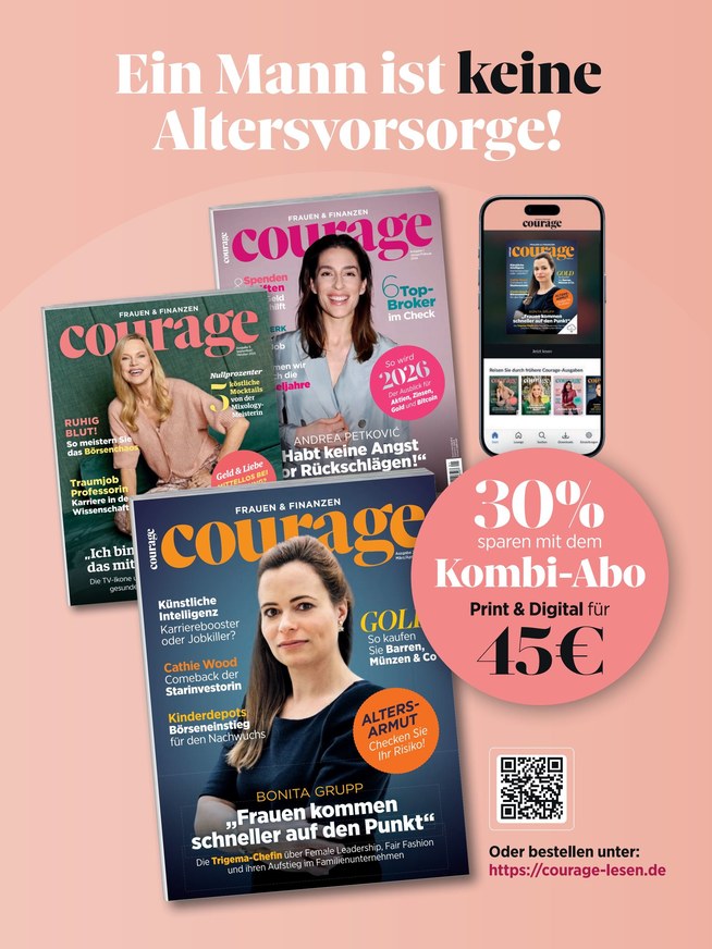 Es geht um Mut, Inspiration, Neugier und ein großes Maß an Unabhängigkeit. Denn die Frau von heute interessiert sich neben Familie und Freundschaften immer für die Finanzwelt. Doch warum haben Sie einen solchen Respekt vor dieser Aufgabe? Die Trend Themen wie Money Mindset, New Work und Gender-Pay-Gap werden ausreichend in Courage besprochen und helfen so den Leserinnen beim großdenken und sich trauen. Neben Interviews mit erfolgreichen Frauen, die ihre Ratschläge teilen, gibt es auch viele Einblicke in Spartipps und Karrierebooster.