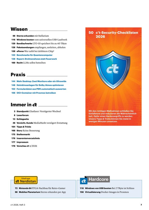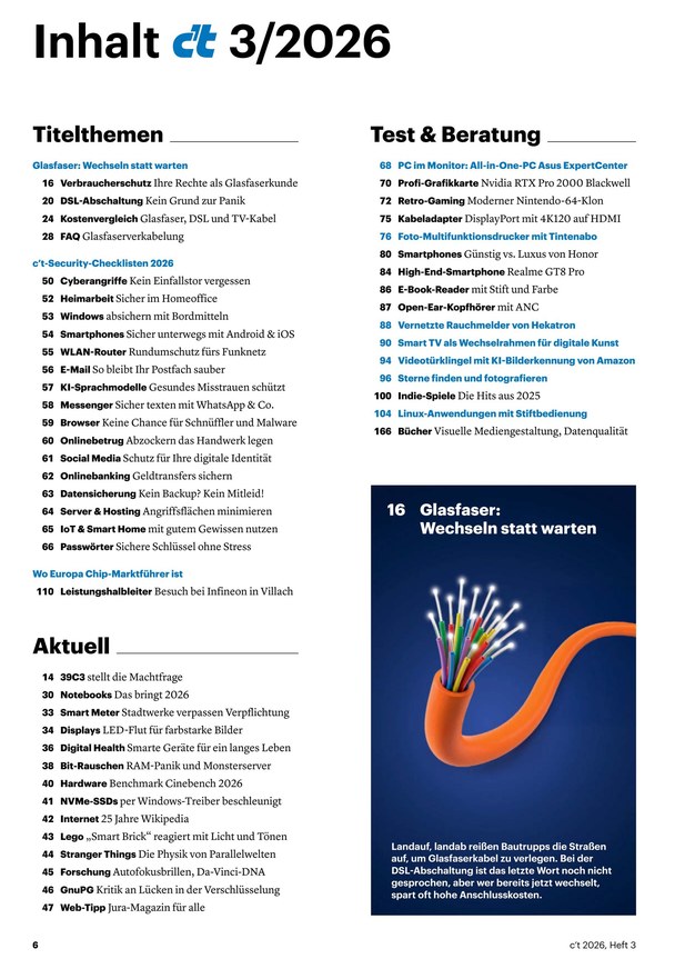 Das im vierzehntägigen Rhythmus erscheinende Fachmagazin c't setzt auf anspruchsvolle und redaktionell unabhängige Berichterstattung. Die IT-Publikation punktet mit Praxisnähe und fachlicher Kompetenz - mehr als 65 fest angestellte Redakteure bilden das größte Expertenteam einer Computerfachzeitschrift im deutschsprachigen Raum. Im ePaper finden fortgeschrittene und ambitionierte Computeranwender die folgenden Ressorts:
