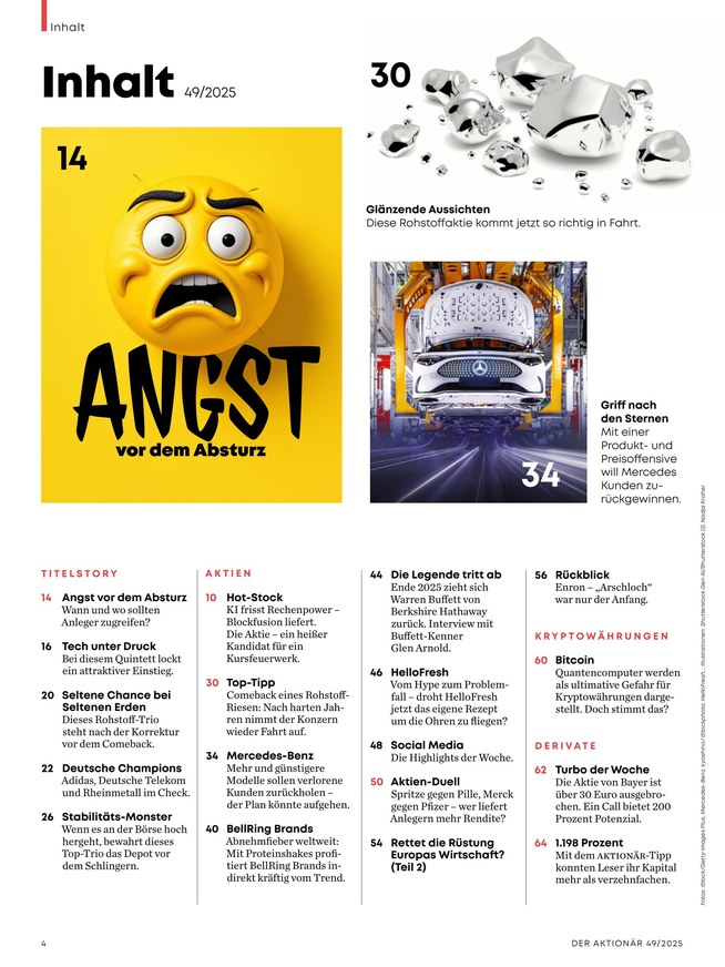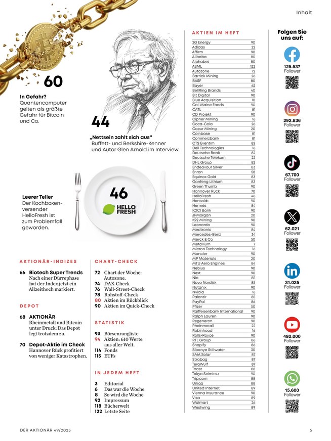 Wöchentlich bringt des Anlegermagazins Der Aktionär die neuesten Entwicklungen auf den Punkt. Privatanleger und auch Neulinge auf dem Parkett bekommen Analysen und Erklärungen aus der Redaktion zu allen wichtigen Themen: Aktien, Fonds, Anleihen, ETFs, Zertifikate, Optionsscheine, Rohstoffe, Edelmetalle und Kryptowährungen. Börsenprofis erläutern erfolgreiche Handelsstrategien für systematische Investments und teilen ihr umfangreiches Wissen in verständlich aufbereiteten Artikeln. Im Hot-Stock und in den regelmäßige erscheinenden Top-Tipps unter der Rubrik „Derivate“ wird das aktuelle Wissen aufbereitet.