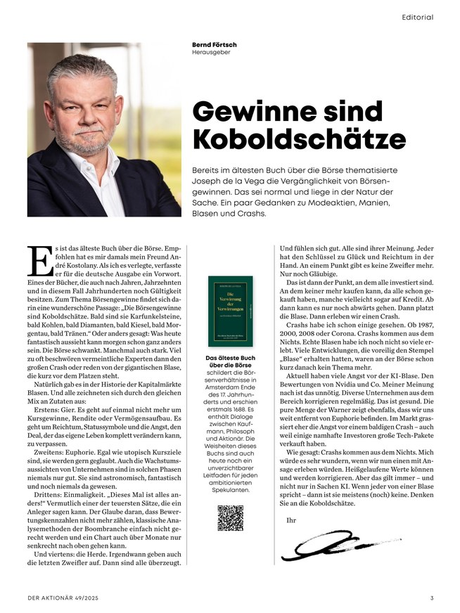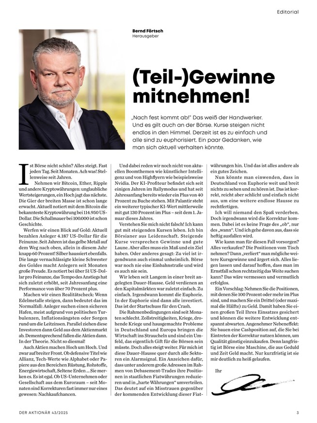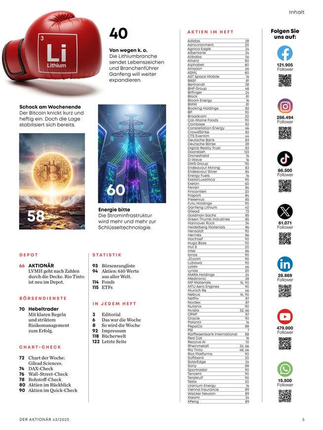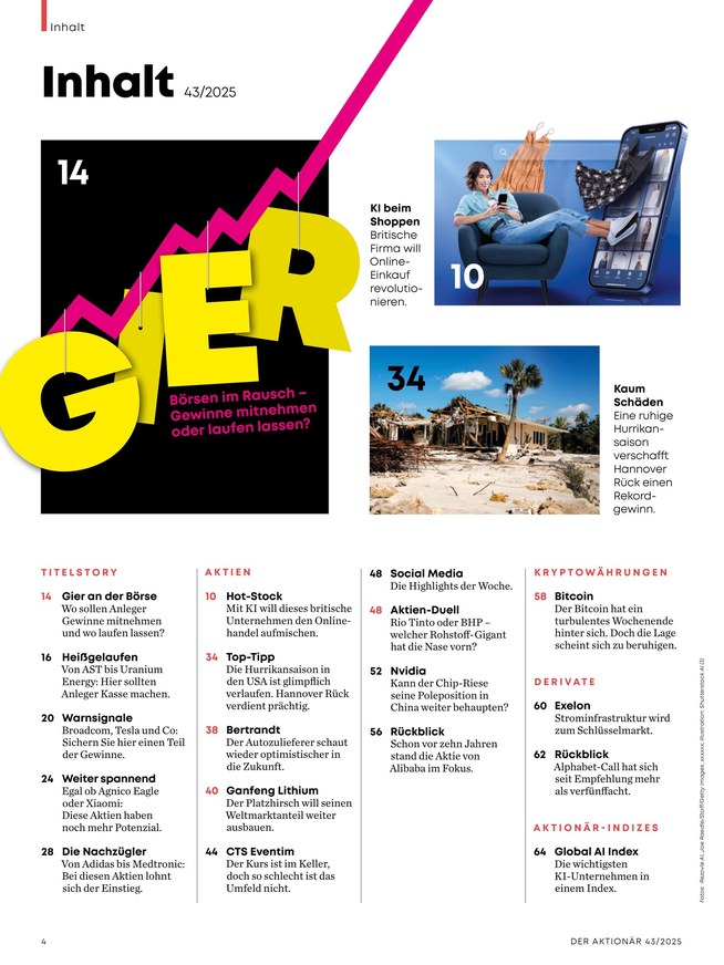 Der Aktionär gilt als das Pflichtblatt an allen deutschen Börsen, denn hier sehen Lesende nicht nur die aktuelle Börsenentwicklung gleich auf den ersten Seiten, vielmehr bietet das Magazin eine breite Mischung von Themen für jede Marktphase.