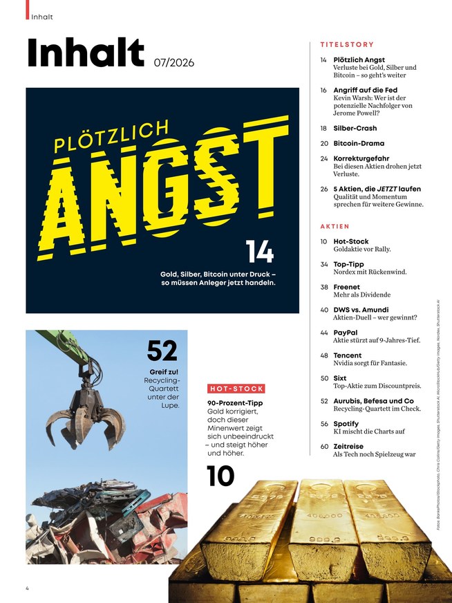 Wöchentlich bringt des Anlegermagazins Der Aktionär die neuesten Entwicklungen auf den Punkt. Privatanleger und auch Neulinge auf dem Parkett bekommen Analysen und Erklärungen aus der Redaktion zu allen wichtigen Themen: Aktien, Fonds, Anleihen, ETFs, Zertifikate, Optionsscheine, Rohstoffe, Edelmetalle und Kryptowährungen. Börsenprofis erläutern erfolgreiche Handelsstrategien für systematische Investments und teilen ihr umfangreiches Wissen in verständlich aufbereiteten Artikeln. Im Hot-Stock und in den regelmäßige erscheinenden Top-Tipps unter der Rubrik „Derivate“ wird das aktuelle Wissen aufbereitet.
