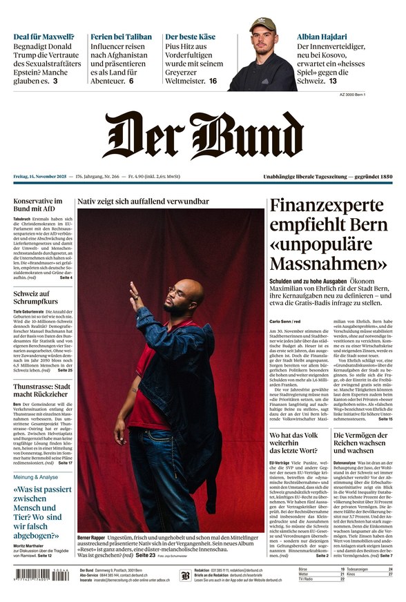 Der Bund ist seit 170 Jahren die Tageszeitung der Bundeshauptstadt Bern. Mit Hintergrundberichten und Analysen aus Politik, Wirtschaft, Lokalem, Kultur und Sport sowie Reportagen und pointierten Kommentaren bietet der Traditionstitel täglich aktuelles Lesevergnügen.