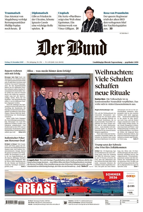 Der Bund ist seit 170 Jahren die Tageszeitung der Bundeshauptstadt Bern. Mit Hintergrundberichten und Analysen aus Politik, Wirtschaft, Lokalem, Kultur und Sport sowie Reportagen und pointierten Kommentaren bietet der Traditionstitel täglich aktuelles Lesevergnügen.