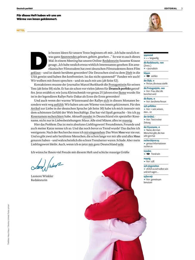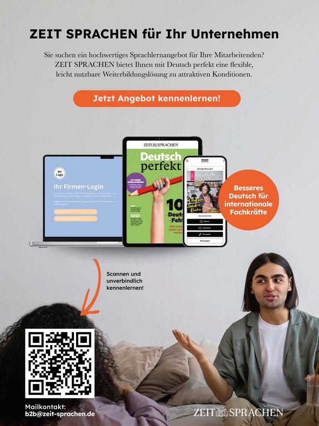 Für alle, die Deutsch als Fremdsprache lernen, ist Deutsch perfekt die ideale Zeitschrift: Jeden Monat bietet das Magazin aus dem Spotlight Verlag zahlreiche Übungen und Tests zu Grammatik und Wortschatz. Außerdem enthalten sind Infos zu aktuellen Geschehnissen in Deutschland, Österreich und der Schweiz. Deutsch perfekt kombiniert spannende Inhalte mit kontinuierlichem Lernfortschritt im Sprachtraining und ist auch als ePaper erhältlich.