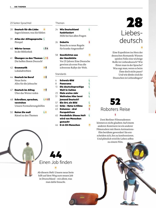 Deutsch perfekt punktet durch 80 Seiten in moderner Aufmachung und Inhalte, die beim Lernen unterstützen. Der Untertitel des Hefts lautet "Einfach Deutsch lernen!" - und diesem Untertitel wird das Heft tatsächlich gerecht. Schwierige Wörter werden in einfacherer Sprache auf Deutsch erklärt, zusätzlich gibt es im Heft eine Vokabelsektion, in der die zentralen Vokabeln in folgende Sprachen übersetzt werden: