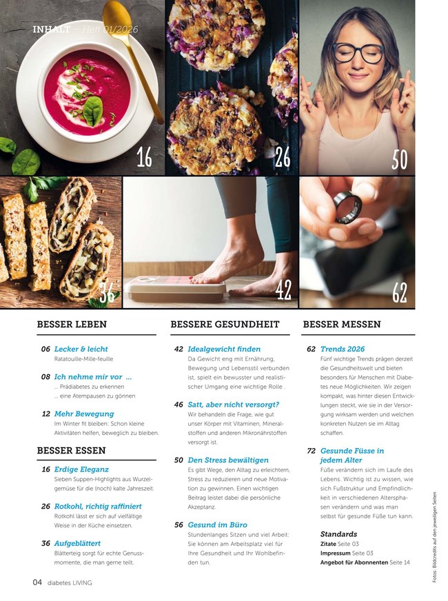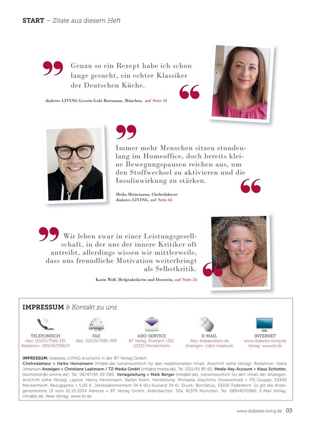 • Besser messen - nicht zuletzt unterstützt Diabetes Living auch beim Alltag mit Diabetes, etwa beim Messen der Blutzuckerwerte. Messgeräte im Test, Vorsorgemaßnahmen oder neue Therapie finden in diesem Bereich Platz.