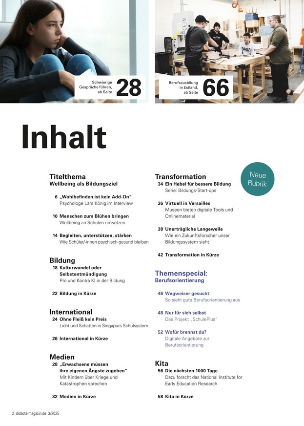 didacta widmet sich als einziges deutsches Fachmagazin dem lebenslangen Lernen. Jede Ausgabe greift relevante Themen aus Kindergarten, Schule, Hochschule, Aus- und Weiterbildung auf und verschafft so einen Gesamtüberblick über die einzelnen Bereiche, Themen und Übergänge des Bildungsverlaufs. Fach- und praxisbezogene Beiträge vermitteln fundiertes Wissen, praktische Tipps und Ideen geben zusätzliche Anregungen für die tägliche pädagogische Arbeit und liefern einen Einblick in das aktuelle Geschehen auf dem Bildungsmarkt.