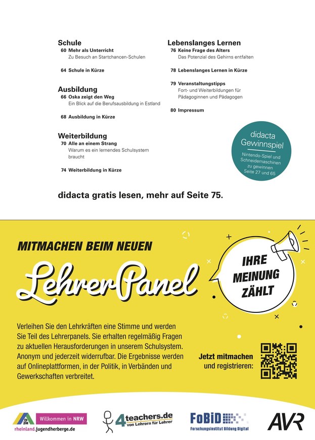 Lehrer lesen didacta! Was Sie als Pädagoge über die Aus- und Weiterbildung an Deutschlands Bildungseinrichtungen wissen müssen, erfahren Sie im ePaper von didacta, dem Magazin für lebenslanges Lernen. Weiterlesen...