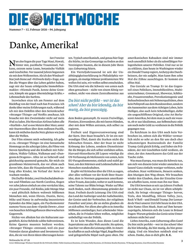 Um stets über alle wichtigen Geschehnisse und Diskurse in der Schweiz auf dem Laufenden zu bleiben, bietet sich das ePaper der Weltwoche an. Das digitale Magazin kann als Einzelausgaben oder im Abonnement erworben werden. Ihr Vorteil durch das Weltwoche-ePaper: Sie können zu jeder Zeit und von überall darauf zugreifen - Computer, Smartphones und Tablets machen es möglich.