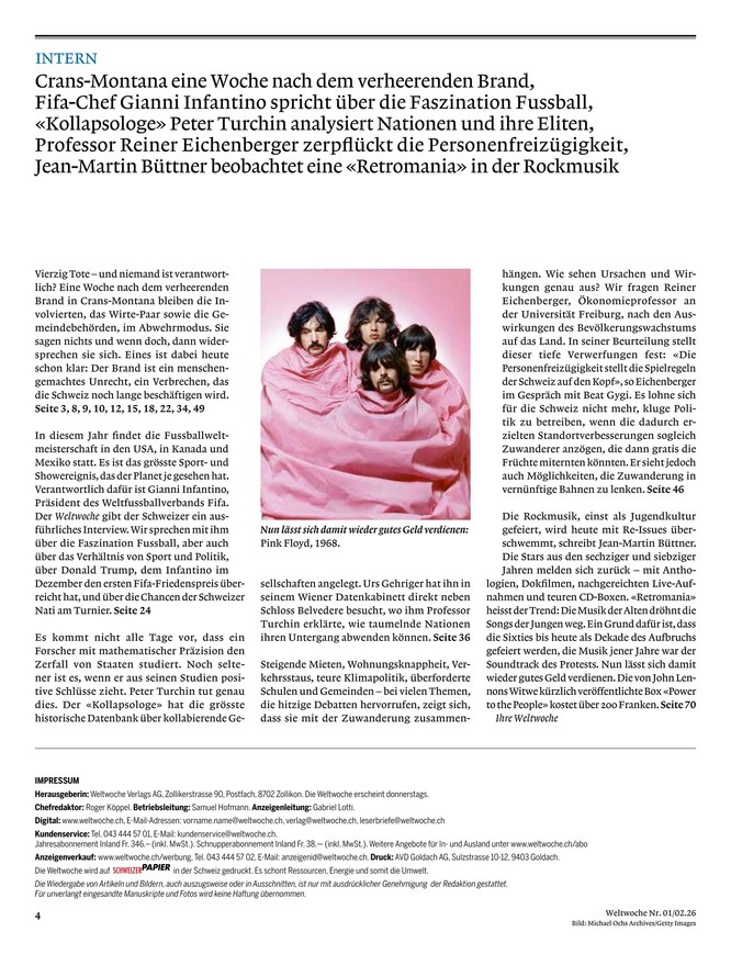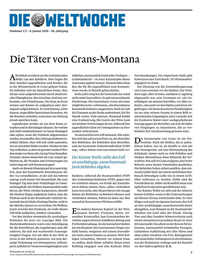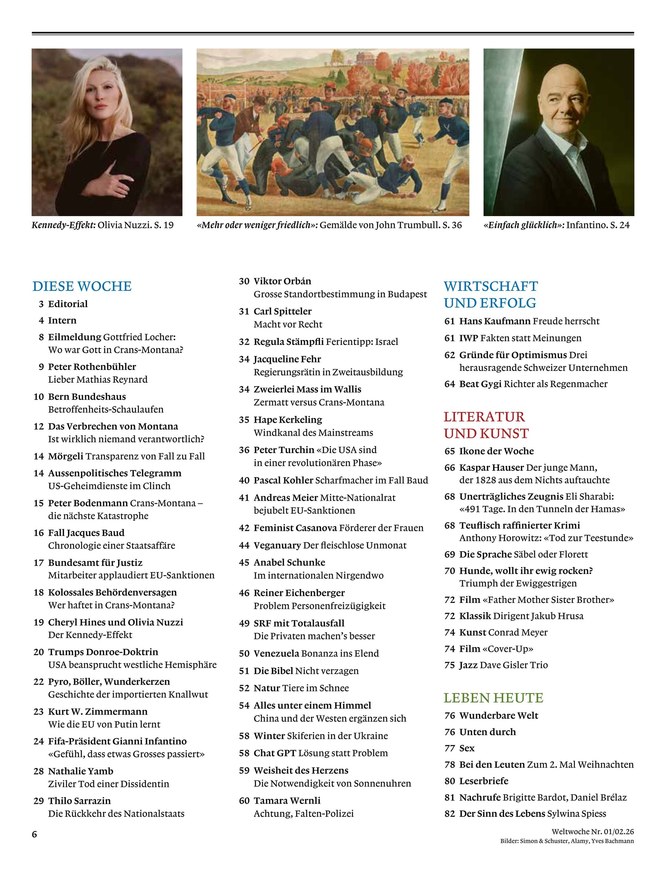 Um stets über alle wichtigen Geschehnisse und Diskurse in der Schweiz auf dem Laufenden zu bleiben, bietet sich das ePaper der Weltwoche an. Das digitale Magazin kann als Einzelausgaben oder im Abonnement erworben werden. Ihr Vorteil durch das Weltwoche-ePaper: Sie können zu jeder Zeit und von überall darauf zugreifen - Computer, Smartphones und Tablets machen es möglich.
