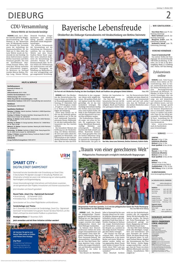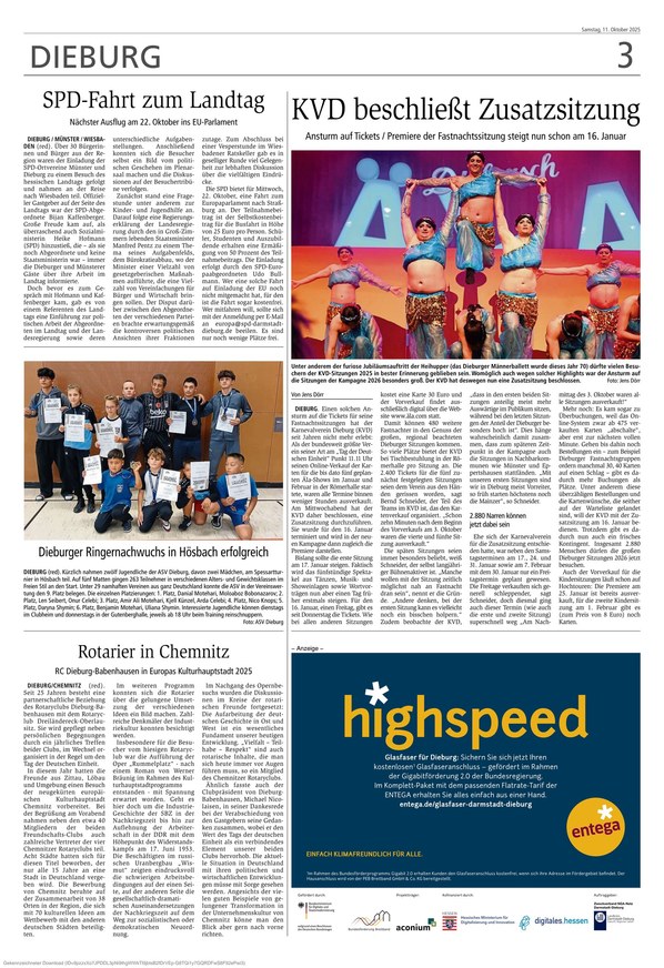 Der Dieburger Anzeiger ist Ihre traditionsreiche Informationsquelle, die mit umfassender Berichterstattung aus Dieburg und Umgebung alle Facetten von aktuellen lokalen Nachrichten über politische Entwicklungen und Wirtschaftsthemen bis hin zu Kultur, Sport und gesellschaftlichen Ereignissen abdeckt.