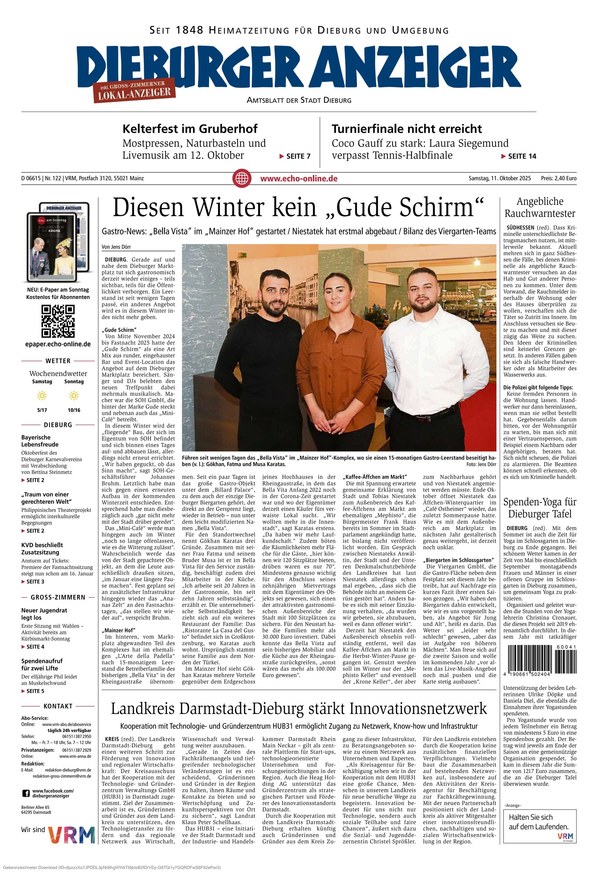 Der Dieburger Anzeiger ist Ihre traditionsreiche lokale Zeitung, die Sie regelmäßig mit den neuesten Nachrichten und spannenden Berichten aus Dieburg und der umliegenden Region versorgt. Zusätzlich bietet er Ihnen überregionale News aus Politik, Wirtschaft, Kultur und Sport. Weiterlesen...