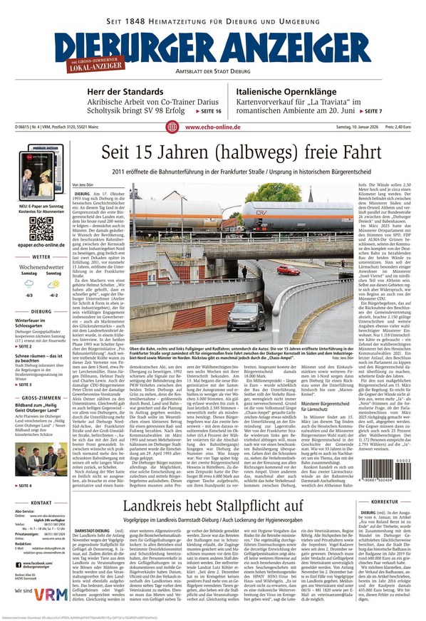 Der Dieburger Anzeiger ist Ihre traditionsreiche Informationsquelle, die mit umfassender Berichterstattung aus Dieburg und Umgebung alle Facetten von aktuellen lokalen Nachrichten über politische Entwicklungen und Wirtschaftsthemen bis hin zu Kultur, Sport und gesellschaftlichen Ereignissen abdeckt.