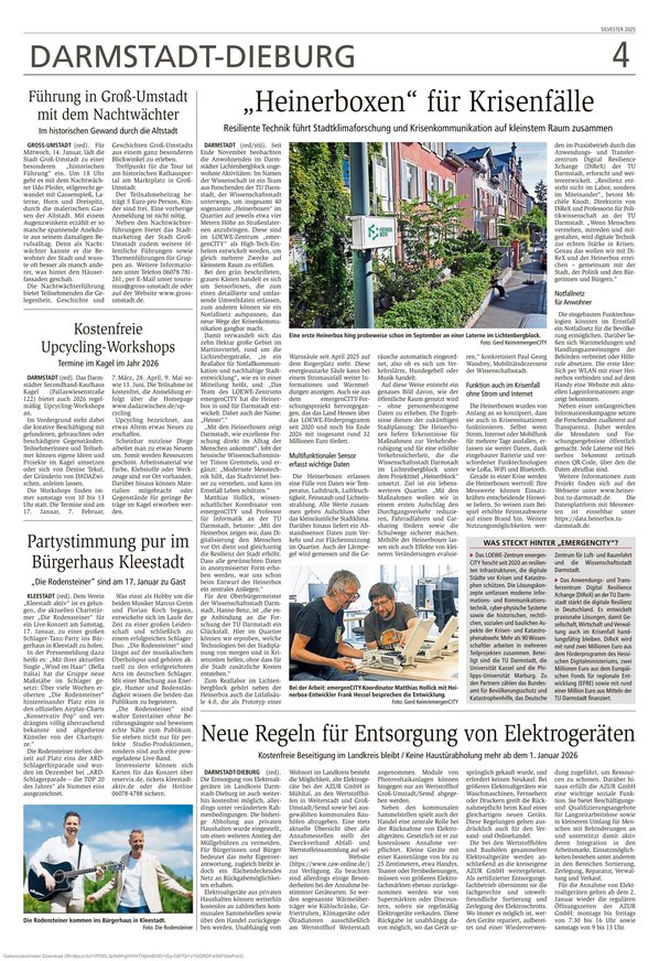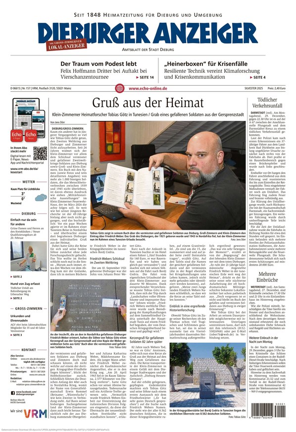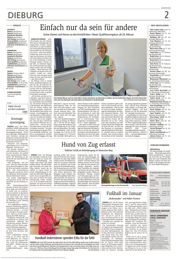 Der Dieburger Anzeiger ist Ihre traditionsreiche Informationsquelle, die mit umfassender Berichterstattung aus Dieburg und Umgebung alle Facetten von aktuellen lokalen Nachrichten über politische Entwicklungen und Wirtschaftsthemen bis hin zu Kultur, Sport und gesellschaftlichen Ereignissen abdeckt.