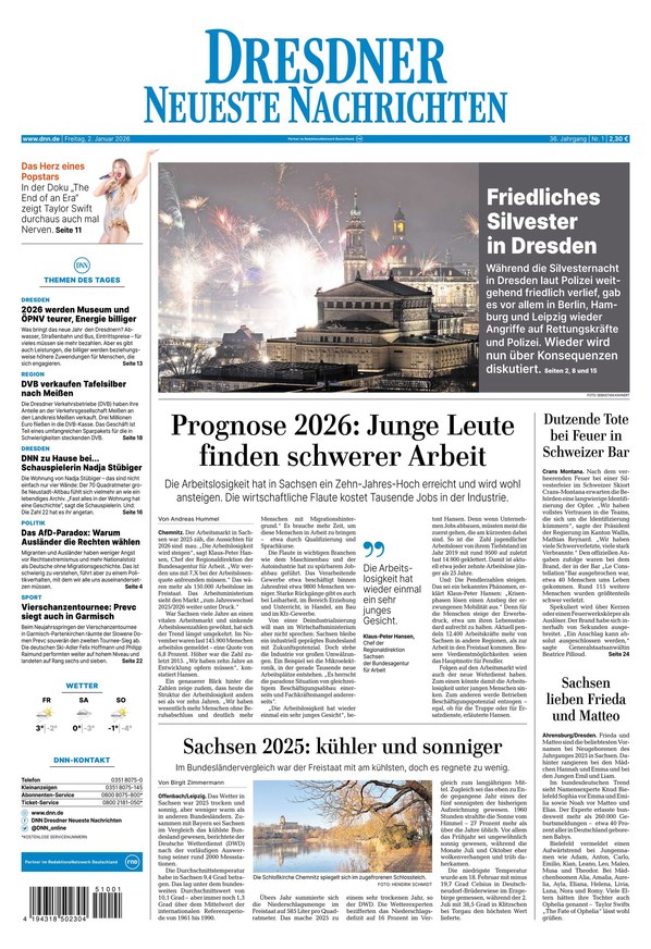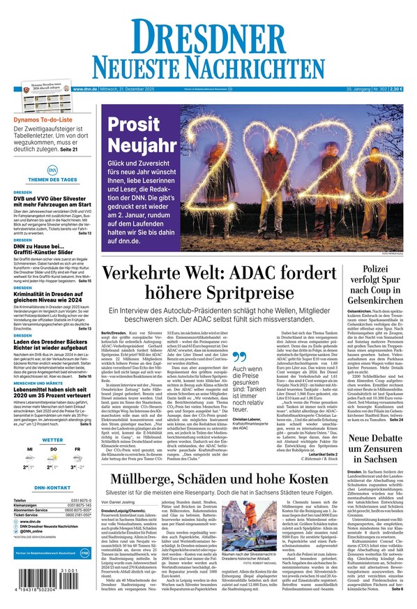 Alle Nachrichten aus Dresden und Umgebung finden Sie täglich in der DNN (Dresdner Neueste Nachrichten): Politik, Wirtschaft, Kultur, Sport und mehr. Das ePaper erscheint täglich von Montag bis Sonntag und ist in allen Inhalten mit der gedruckten Zeitung identisch. Sie erhalten mit der digitalen Ausgabe die gewohnte Qualität Ihrer Tageszeitung, können jedoch zusätzlich Features wie Suchfunktion oder Zoom nutzen.