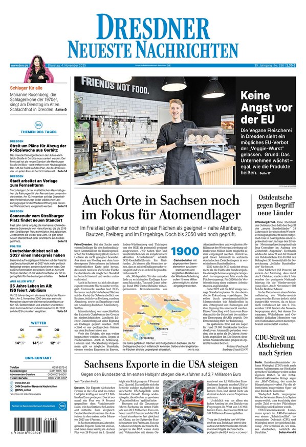 Alle Nachrichten aus Dresden und Umgebung finden Sie täglich in der DNN (Dresdner Neueste Nachrichten): Politik, Wirtschaft, Kultur, Sport und mehr. Das ePaper erscheint täglich von Montag bis Sonntag und ist in allen Inhalten mit der gedruckten Zeitung identisch. Sie erhalten mit der digitalen Ausgabe die gewohnte Qualität Ihrer Tageszeitung, können jedoch zusätzlich Features wie Suchfunktion oder Zoom nutzen.