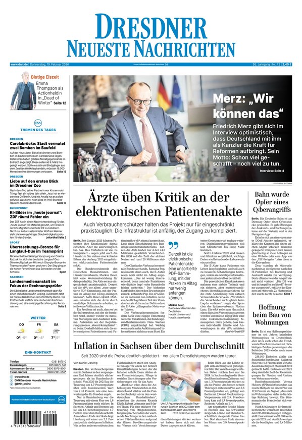 Alle Nachrichten aus Dresden und Umgebung finden Sie täglich in der DNN (Dresdner Neueste Nachrichten): Politik, Wirtschaft, Kultur, Sport und mehr. Das ePaper erscheint täglich von Montag bis Sonntag und ist in allen Inhalten mit der gedruckten Zeitung identisch. Sie erhalten mit der digitalen Ausgabe die gewohnte Qualität Ihrer Tageszeitung, können jedoch zusätzlich Features wie Suchfunktion oder Zoom nutzen.
