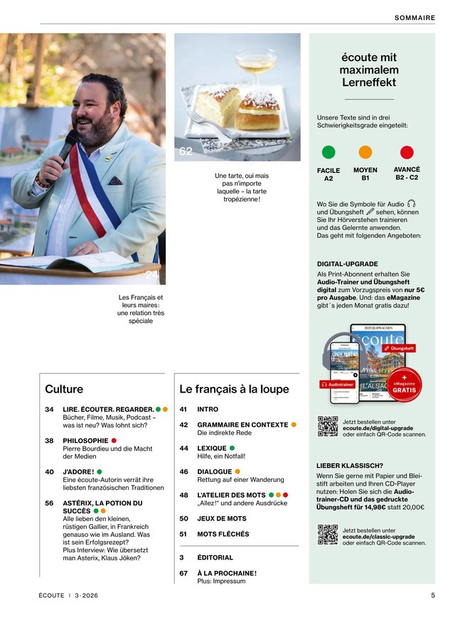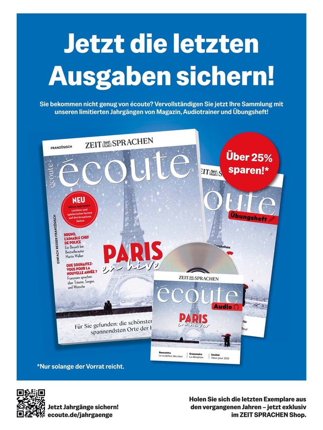 Écoute ist ein französischsprachiges Magazin, das sich an Leser richtet, die die französische Sprache mithilfe aktueller Themen lernen möchten. Gleichzeitig liefert es spannende Einblicke in die französische Lebensart. Weiterlesen...