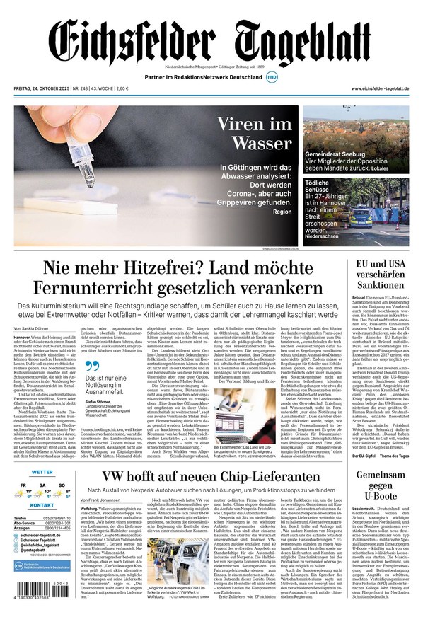 Als regionale Tageszeitung berichtet das Eichsfelder Tagesblatt über die aktuellen Geschehnisse im Altkreis Duderstadt. Beim Eichsfelder Tagesblatt handelt es sich um eine Lokalausgabe des Göttinger Tageblatts. Weiterlesen...