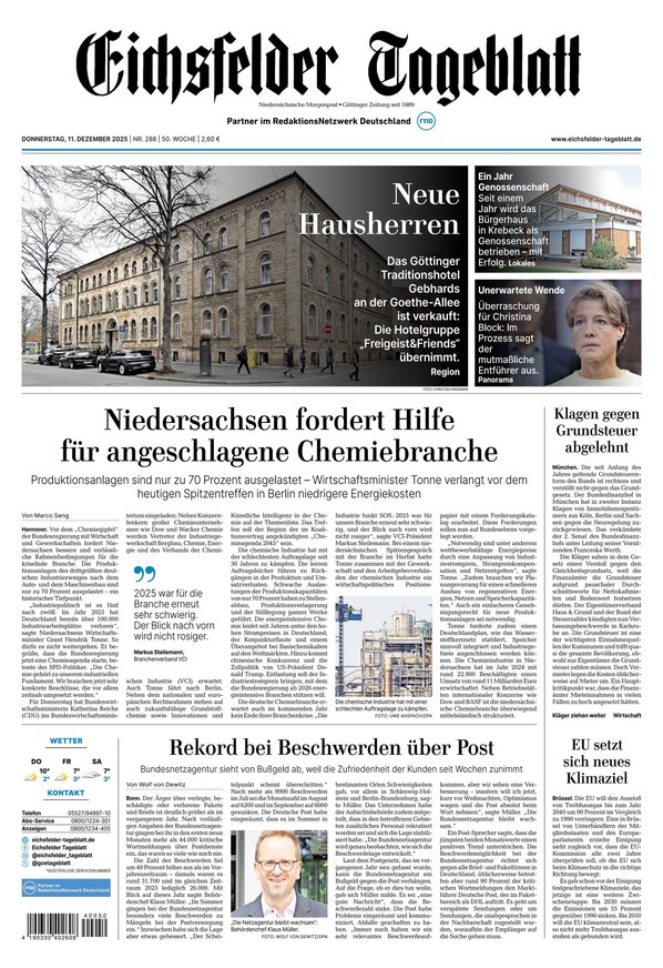 Als regionale Tageszeitung berichtet das Eichsfelder Tagesblatt über die aktuellen Geschehnisse im Altkreis Duderstadt. Beim Eichsfelder Tagesblatt handelt es sich um eine Lokalausgabe des Göttinger Tageblatts. Weiterlesen...