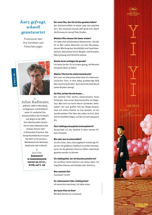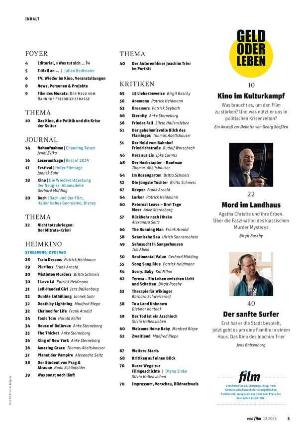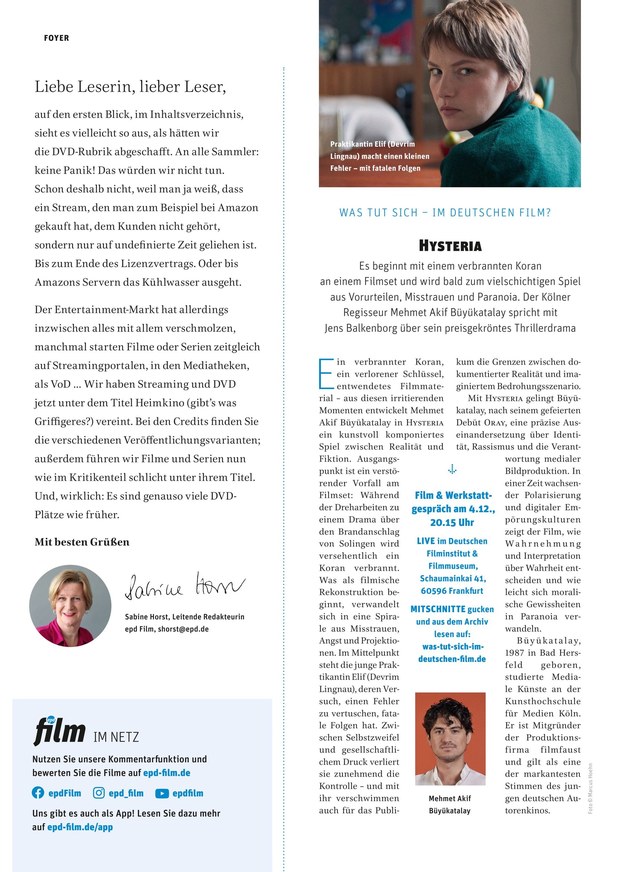 Das Magazin für Filmbegeisterte – von Kino bis Online-Video. epd Film, die aktuelle Filmzeitschrift des Evangelischen Pressedienstes, ist das Magazin für Kinogänger und Filmfans, Fernsehzuschauer und Videonutzer, Filmemacher und Produzenten, Kinobesitzer und Verleiher. Jeden Monat neu: aktuelle Filmkritiken, News von Festivals, neue Trends und Projekte, Filmgeschichte, Filmpolitik, Filmwirtschaft und TV-Tipps.