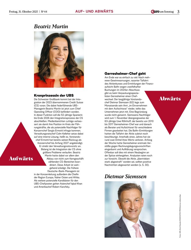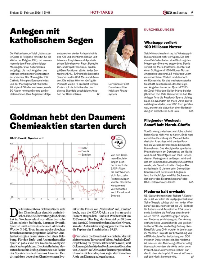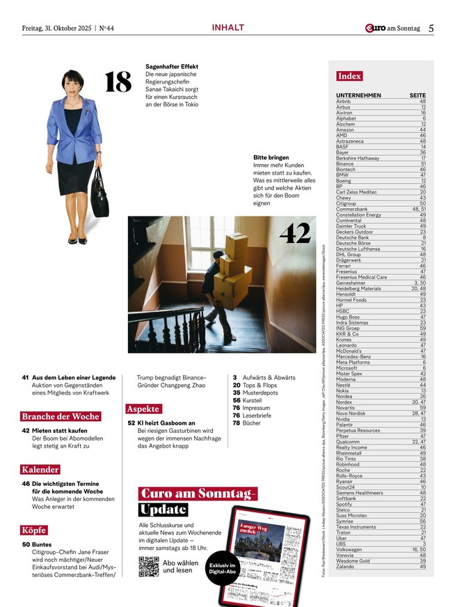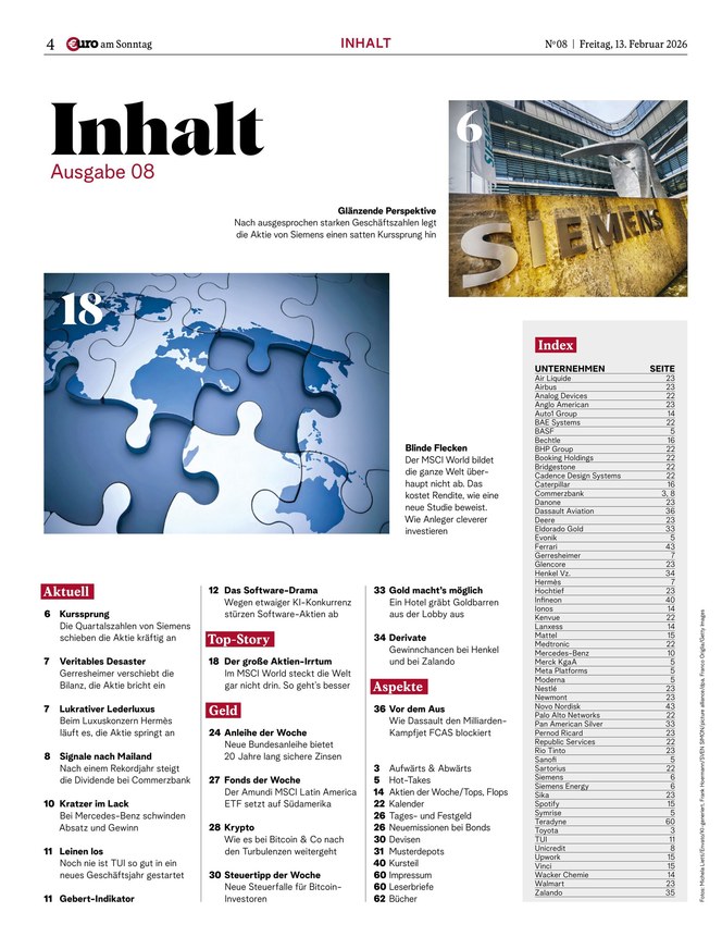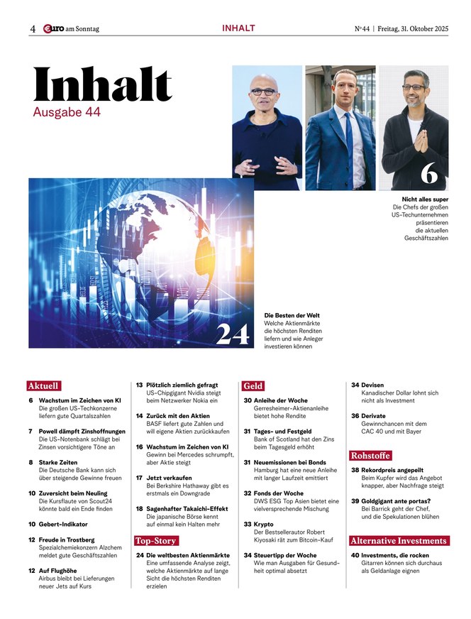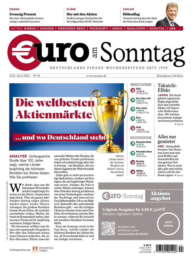 Mit €uro am Sonntag, Deutschlands Finanz-Wochenzeitung seit 1998, haben Anleger die wichtigsten Themen der Börsenwoche stets im Blick.