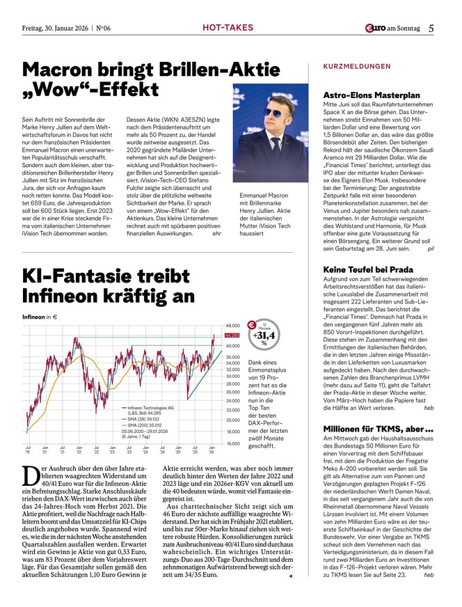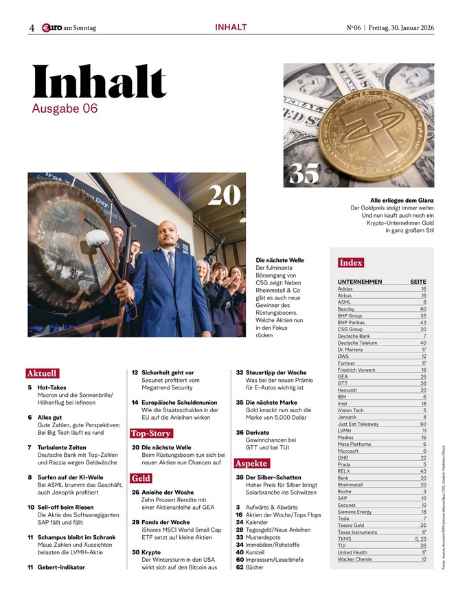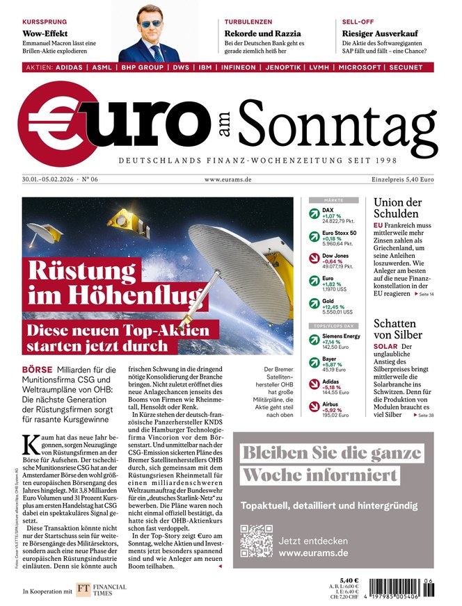 Mit €uro am Sonntag, Deutschlands Finanz-Wochenzeitung seit 1998, haben Anleger die wichtigsten Themen der Börsenwoche stets im Blick.