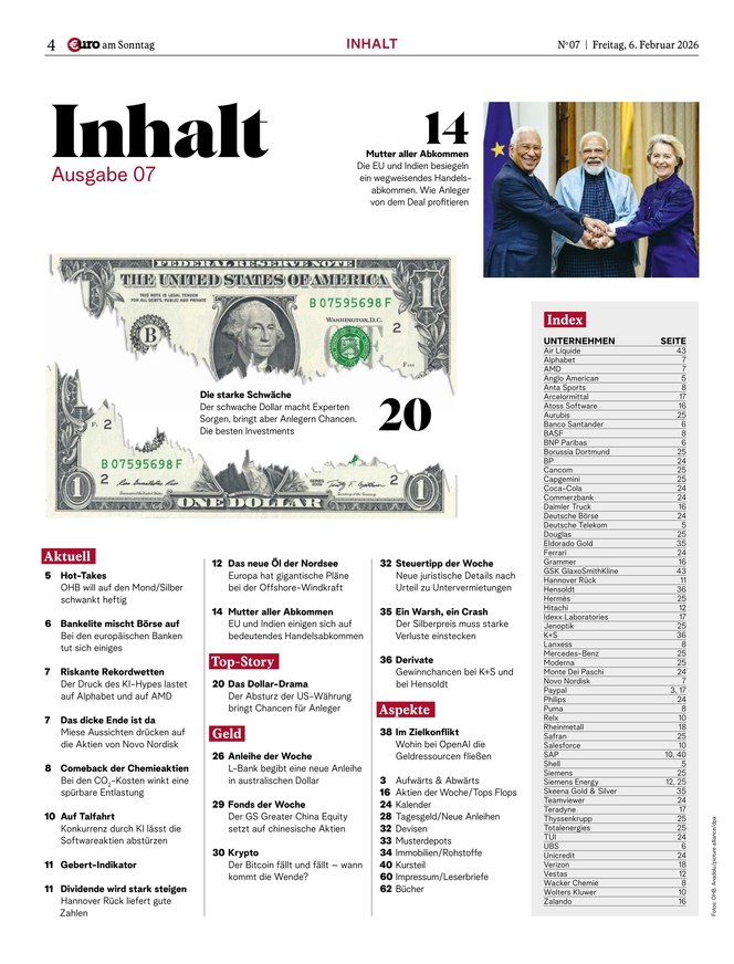 Mit €uro am Sonntag, Deutschlands Finanz-Wochenzeitung seit 1998, haben Anleger die wichtigsten Themen der Börsenwoche stets im Blick.