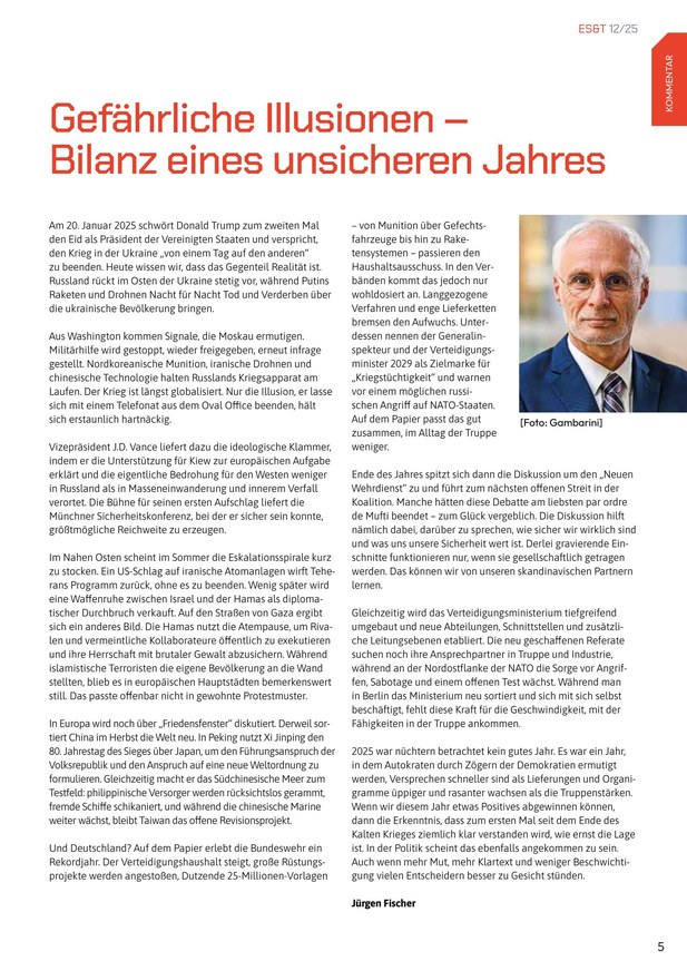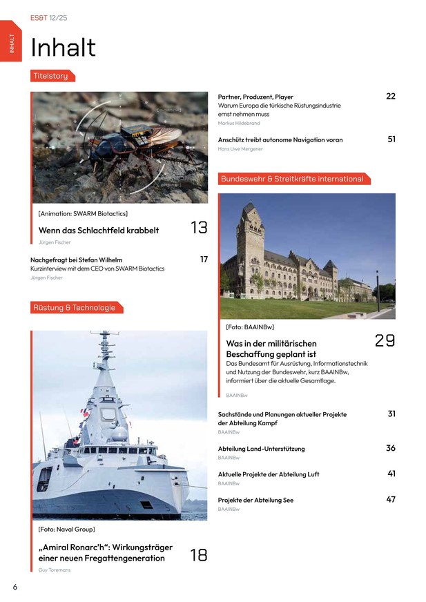 Erfahren Sie in ES&T alles über aktuelle Sicherheitspolitik, Streitkräfte, Wirtschaft, Rüstung und Logistik. ES&T erscheint in enger Zusammenarbeit mit der Bundeswehr, dem Bundesministerium der Verteidigung und dem nachgeordneten Ämterbereich.
