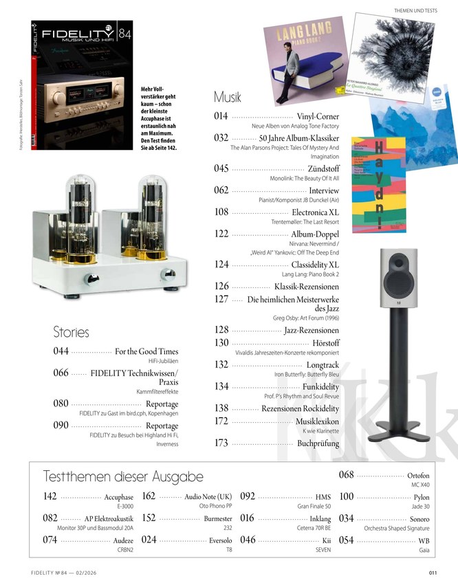 FIDELITY ist das Magazin für Audio- und Stereo-Liebhaber. Auf bis zu 200 Seiten erfahren Musikenthusiasten hier alles über neueste Hardware und Equipment, aber auch aktuelle Musikveröffentlichungen finden in dem Magazin ihren Platz. In ausführlichen Rezensionen geben die Redakteure Empfehlungen, wobei sowohl rockige als auch Pop-Titel oder andere Musikgenres zum Tragen kommen. Trotzdem steht im Fokus der FIDELITY insbesondere das ausführliche Testen und Vergleichen von Equipment, angefangen bei Plattenspielern über Kopfhörer bis hin zu Verstärkern und Boxen. Lassen Sie sich die aktuelle Ausgabe der FIDELITY nicht entgehen und lesen Sie das Magazin als praktisches ePaper direkt hier im iKiosk. Dank des digitalen Formats können Sie Ihre Zeitschrift jederzeit und überall abrufen.