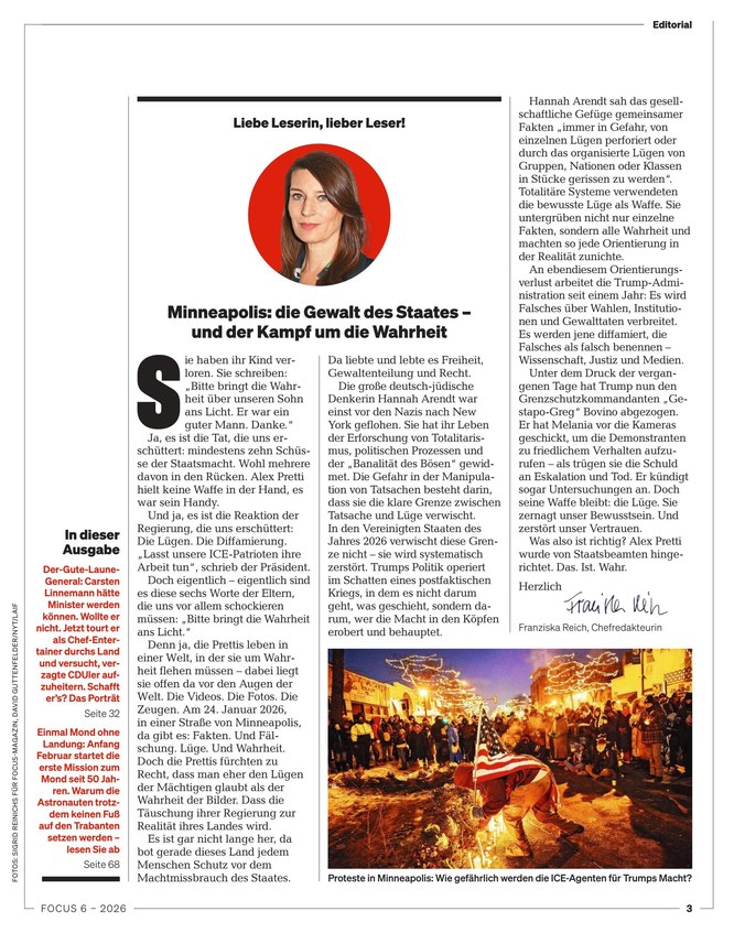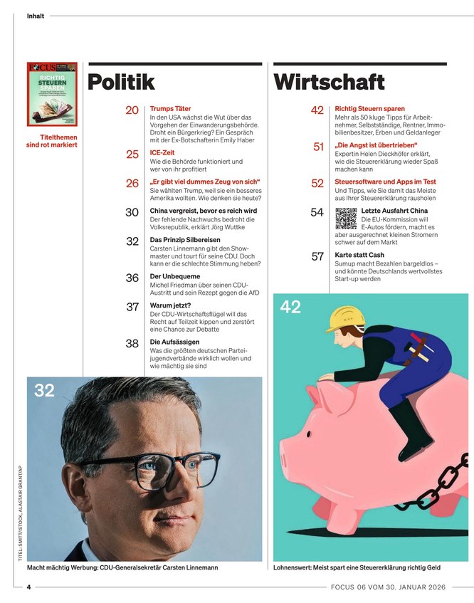 Der FOCUS liefert alle Informationen zu Themen aus den Bereichen Politik, Wirtschaft, Kultur, Gesellschaft, Gesundheit, Forschung und Technik. Alles Wichtige wird in Texten und Bildern so aufbereitet, dass in kurzer Zeit möglichst viele Informationen aufgenommen werden. Das deutsche Nachrichtenmagazin erscheint wöchentlich, die neue FOCUS-Ausgabe erscheint jeweils am Donnerstag - auch als ePaper.