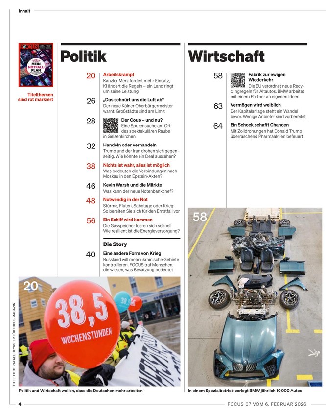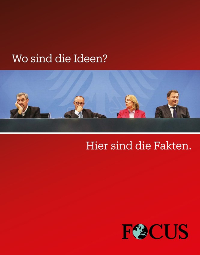 Der FOCUS liefert alle Informationen zu Themen aus den Bereichen Politik, Wirtschaft, Kultur, Gesellschaft, Gesundheit, Forschung und Technik. Alles Wichtige wird in Texten und Bildern so aufbereitet, dass in kurzer Zeit möglichst viele Informationen aufgenommen werden. Das deutsche Nachrichtenmagazin erscheint wöchentlich, die neue FOCUS-Ausgabe erscheint jeweils am Donnerstag - auch als ePaper.
