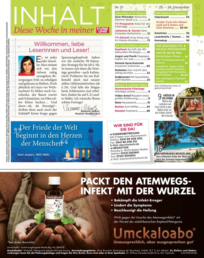 Rund um das ausführliche TV-Programm bietet FUNK UHR Schwerpunktthemen wie Gesundheit und Wellness, Hintergrundinformationen und aktuelle News zu Ernährung, Mode, Beauty, Partnerschaft und Familie, Tipps zu Geld, Recht und Haushalt. Weiterlesen...