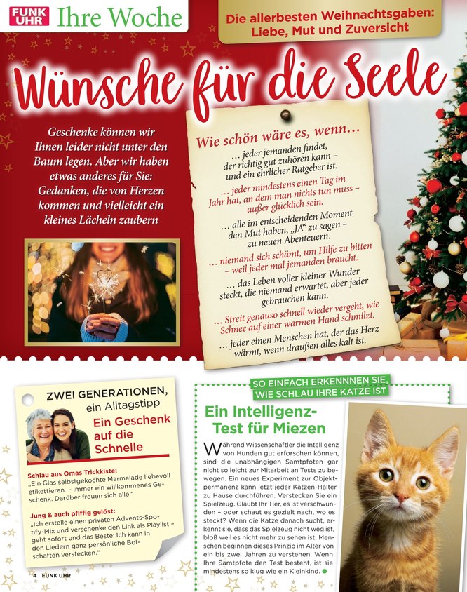 Außerdem Reportagen über besondere Menschen, Geschichten voller Emotionalität und jeden Monat ein Wunschthema.