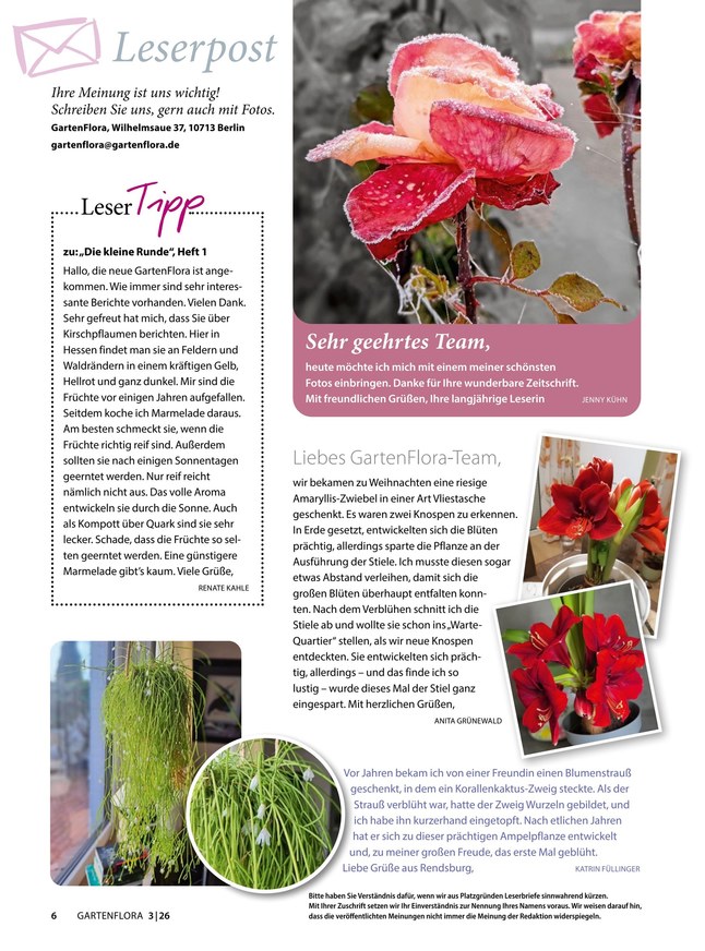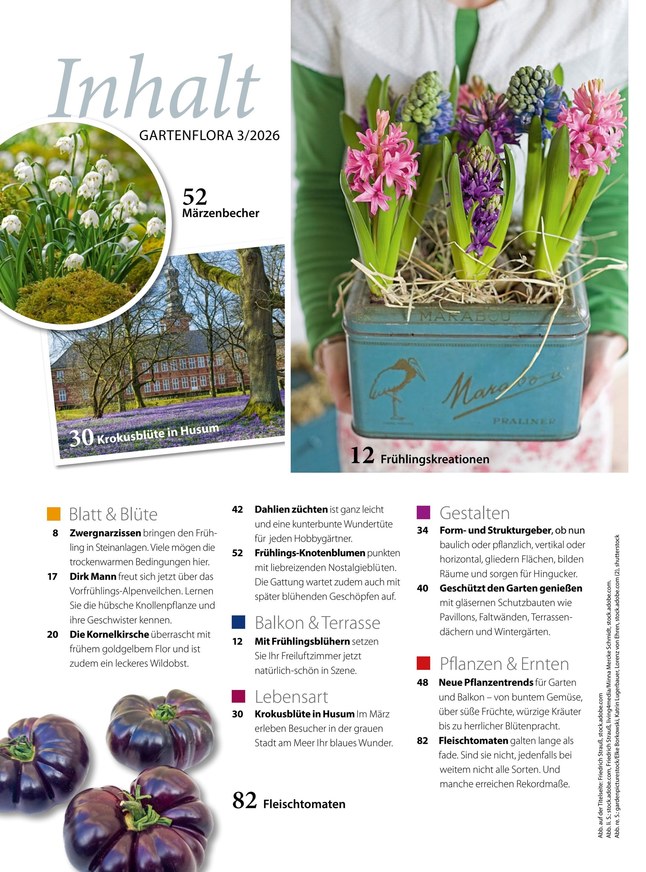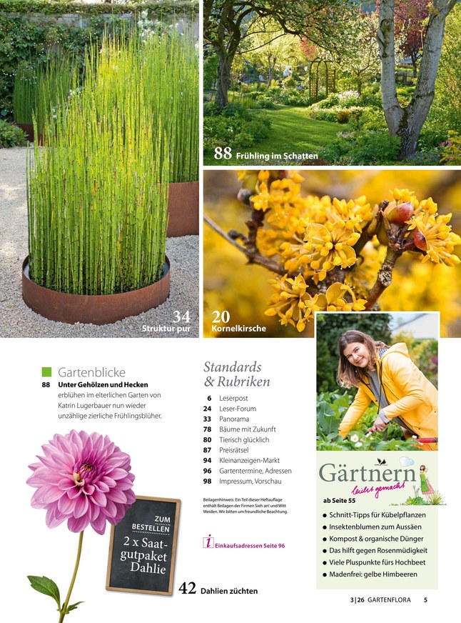 Bei GartenFlora dreht sich alles um den heimischen Garten, die richtige Pflege der Grünpflanzen und eine moderne, stilvolle Gestaltung des Outdoor-Bereichs. Praxisbezogen und verständlich ist sie eine Hilfe für erfolgreiches Gärtnern und berichtet in ausführlichen, reich bebilderten Artikeln über Zier- und Nutzgärten oder außergewöhnlich gestaltete Privatgärten. Abgerundet wird das Angebot durch viele Ratgeber, Anleitungen, Vergleiche, Tests und mehr. Möchten Sie die GartenFlora lesen, dann finden Sie die neueste Ausgabe hier im iKiosk als ePaper oder PDF zum Download. Das Magazin erscheint im monatlichen Rhythmus und ist entweder als Einzelausgabe, mit einer Laufzeit von drei Monaten oder als Jahresabonnement erhältlich.
