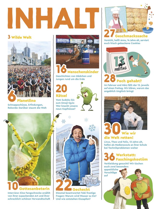 Kein Thema ist zu klein oder zu groß für GEOlino: der Aufbau eines Zellkerns und die Weiten des Weltalls werden auf sympathisch spielerische Art und Weise erklärt. Wissensvermittlung geht einher mit Spaß und mit hohem Praxisbezug. Wird über das Leben im Dschungel Amazoniens oder im ewigen Eis der Arktis berichtet, steht das Leben der Kinder an diesen Orten im Vordergrund. In jeder Ausgabe von GEOlino finden Sie zudem die Rubrik "Menschenkinder", die vier Geschichten aus dem Leben der Kinder dieser Welt präsentiert. Ebenfalls in jeder Ausgabe: "Gib mir 5", eine Kategorie in der "fünfmal staunen" zu alltäglichen Themen auf der Tagesordnung steht. Kleine Tierfreunde werden mit GEOlino ihre Freude haben, denn häufig zählt eine Tiergeschichte zu den Titelthemen. Rätsel-Fans hingegen begeistern der Ratekrimi und das beliebte "rätselhafte Labyrinth".
