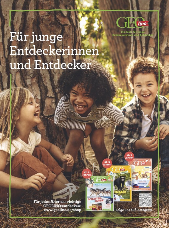 GEOlino ist das Erlebnisheft von GEO. Altersgerecht werden Kinder im Alter zwischen acht und 14 Jahren an hochinteressante Themen aus Wissenschaft und Forschung herangeführt. Komplexe Sachverhalte werden verständlich und unterhaltsam aufbereitet, knifflige Rätsel fesseln die jungen Leser und Leserinnen bei der Lektüre des digitalen Magazins. Alle Inhalte der gedruckten Ausgabe finden sich in gleicher Form im ePaper, das am Smartphone, Tablet oder Computer gelesen werden kann.