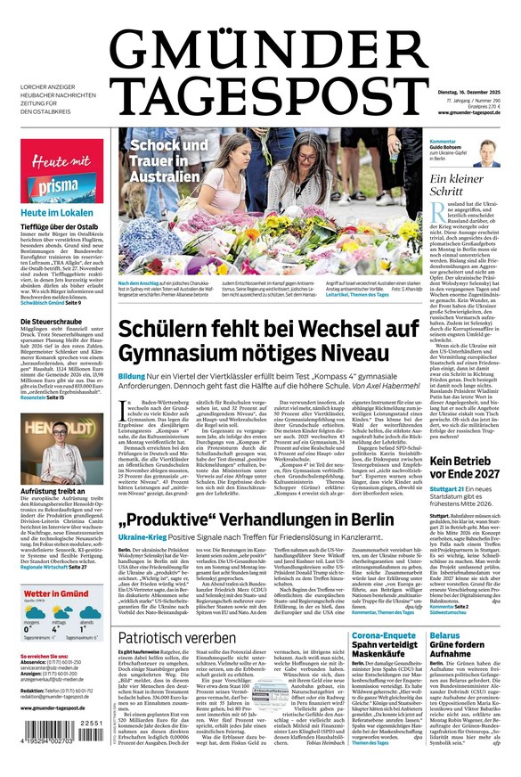 Die Gmünder Tagespost ist die lokale Tageszeitung im Ostalbkreis. Das ePaper informiert von Montag bis Samstag über alle wichtigen Themen in der Region und darüber hinaus. Weiterlesen...