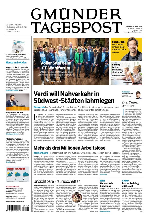 Die Gmünder Tagespost ist die lokale Tageszeitung im Ostalbkreis. Das ePaper informiert von Montag bis Samstag über alle wichtigen Themen in der Region und darüber hinaus. Weiterlesen...