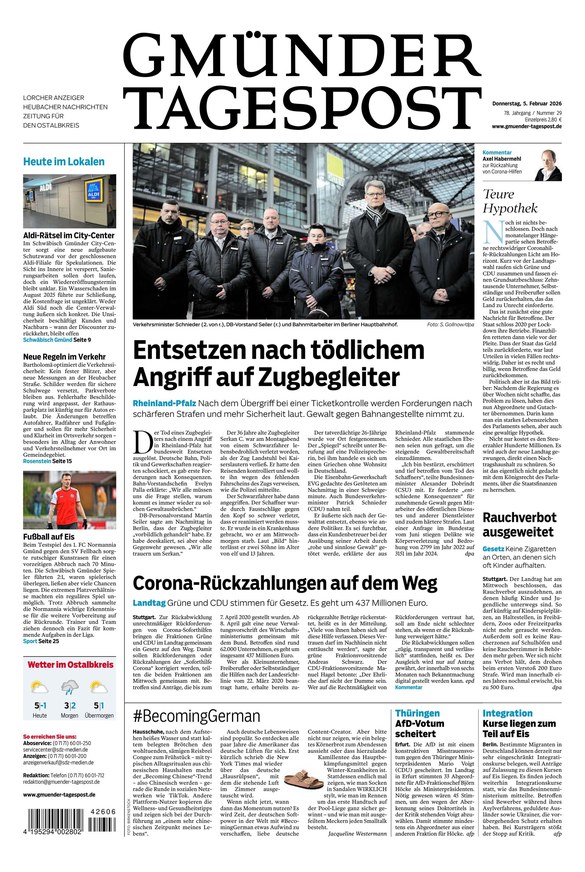 Die Gmünder Tagespost ist die lokale Tageszeitung im Ostalbkreis. Das ePaper informiert von Montag bis Samstag über alle wichtigen Themen in der Region und darüber hinaus. Weiterlesen...