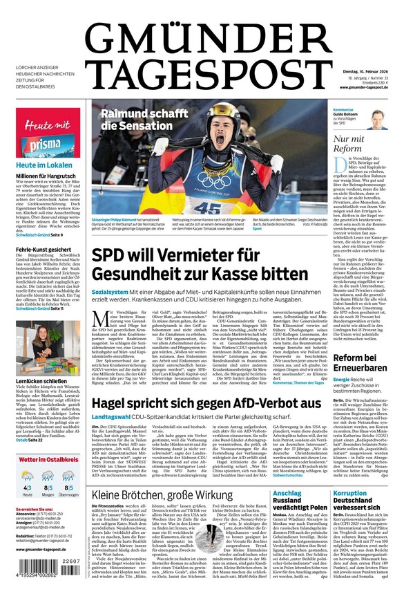Die Gmünder Tagespost ist die lokale Tageszeitung im Ostalbkreis. Das ePaper informiert von Montag bis Samstag über alle wichtigen Themen in der Region und darüber hinaus. Weiterlesen...