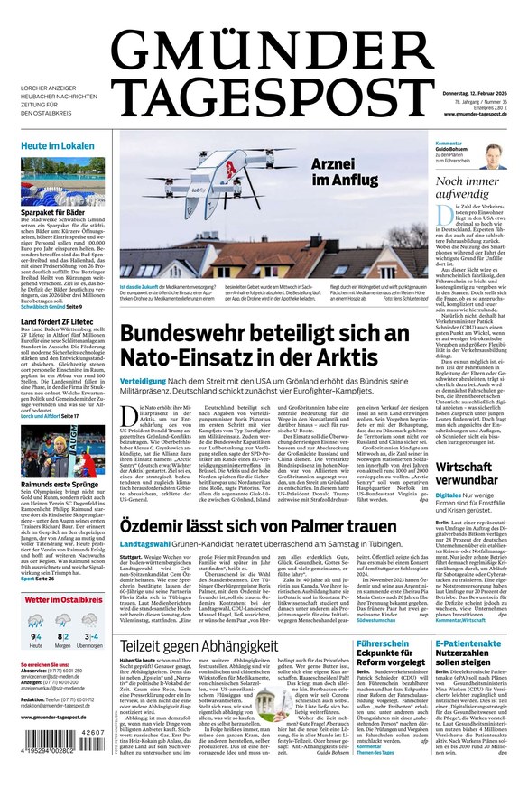 Die Gmünder Tagespost ist die lokale Tageszeitung im Ostalbkreis. Das ePaper informiert von Montag bis Samstag über alle wichtigen Themen in der Region und darüber hinaus. Weiterlesen...