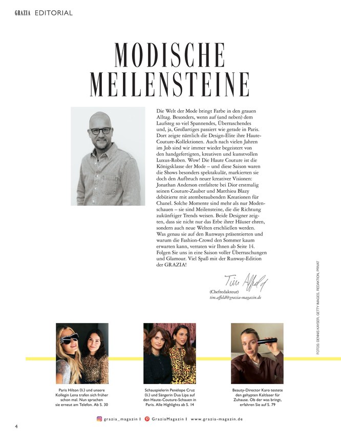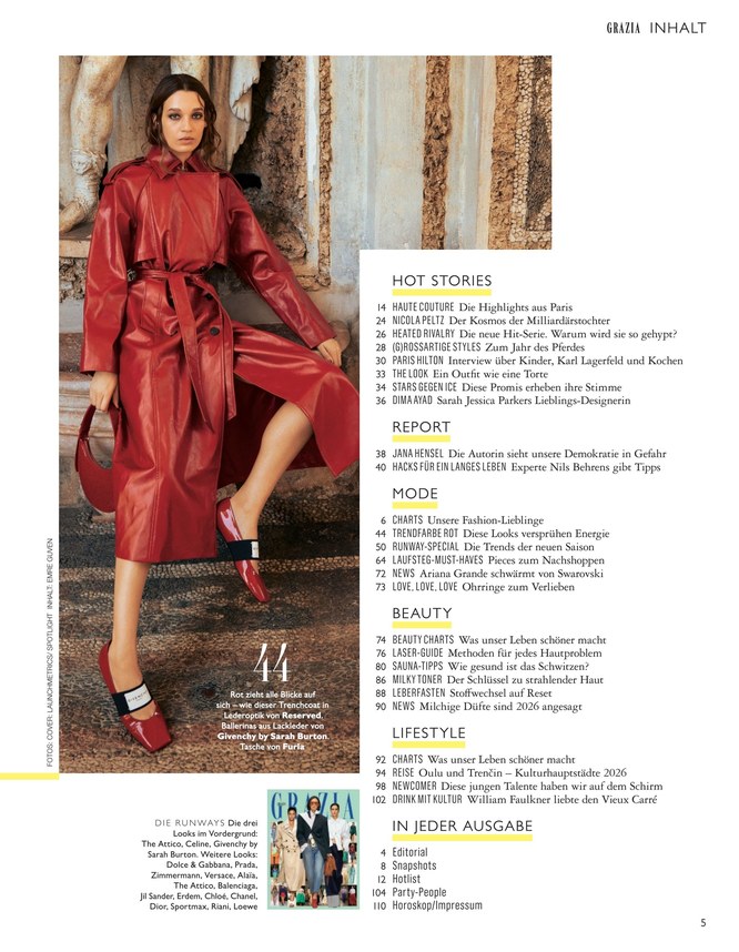 Damit garantiert die Redaktion des Magazins einen umfassenden Einblick in das Leben der weltweit größten Stars und stellt für Sie wertvolle Tipps für die neuesten Looks zum Nachmachen bereit. Sie finden die frischen Styles der Stars und größten Modesünden neben den besten Tipps für Ihren nächsten Urlaub. Darüber hinaus lesen in der wöchentlichen Kolumne lustige Anekdoten aus dem Alltag. Damit wird Grazia eine umfassende Zeitschrift für den Alltag. Ob es die neuesten Accessoires oder die Trends jeder Jahreszeit sind – Sie bleiben mit der Grazia immer aktuell. Wiederkehrende Elemente sind auch das Horoskop und ein Short-Report über die neuesten Geschehnisse.