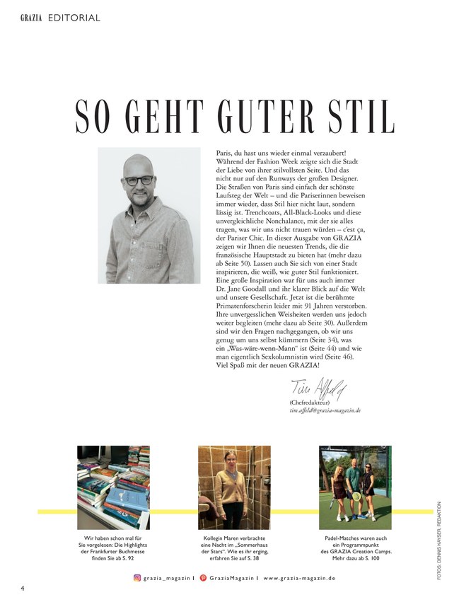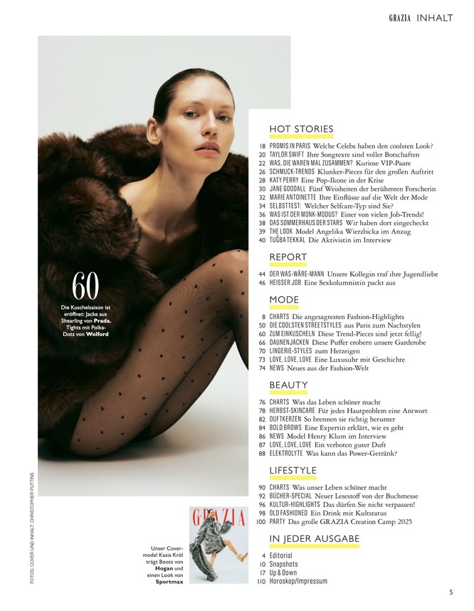 Damit garantiert die Redaktion des Magazins einen umfassenden Einblick in das Leben der weltweit größten Stars und stellt für Sie wertvolle Tipps für die neuesten Looks zum Nachmachen bereit. Sie finden die frischen Styles der Stars und größten Modesünden neben den besten Tipps für Ihren nächsten Urlaub. Darüber hinaus lesen in der wöchentlichen Kolumne lustige Anekdoten aus dem Alltag. Damit wird Grazia eine umfassende Zeitschrift für den Alltag. Ob es die neuesten Accessoires oder die Trends jeder Jahreszeit sind – Sie bleiben mit der Grazia immer aktuell. Wiederkehrende Elemente sind auch das Horoskop und ein Short-Report über die neuesten Geschehnisse.