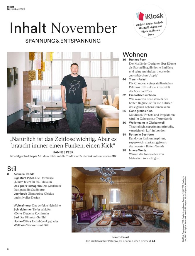 Mit der H.O.M.E. lernen Sie die neusten Trends aus den Bereichen Architektur, Design und Innenausstattung hautnah kennen. Lassen Sie sich von den Fotostrecken inspirieren und sammeln Sie Ideen für Ihr eigenes Heim. Sie erhalten die H.O.M.E. als ePaper hier im iKiosk. Dank des mobilen Formats können Sie die neueste Ausgabe bequem unterwegs oder zuhause lesen, wobei Sie selbstverständlich auf sämtliche Inhalte der klassischen Printversion Zugriff haben. Zusätzlich steht Ihnen unser Archiv zur Verfügung, in dem Sie zahlreiche ältere Ausgaben finden.