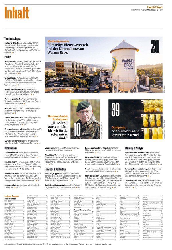 Das Handelsblatt informiert über alles Wichtige rund um Unternehmen, Finanzen, Politik und Technik. Das ePaper der Tageszeitung ist auf Wirtschaftsnachrichten aus Deutschland und der Welt fokussiert. Weiterlesen...