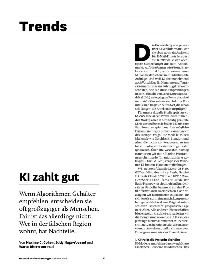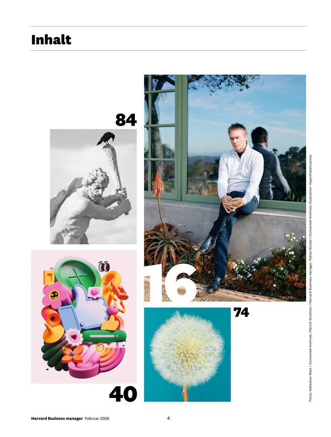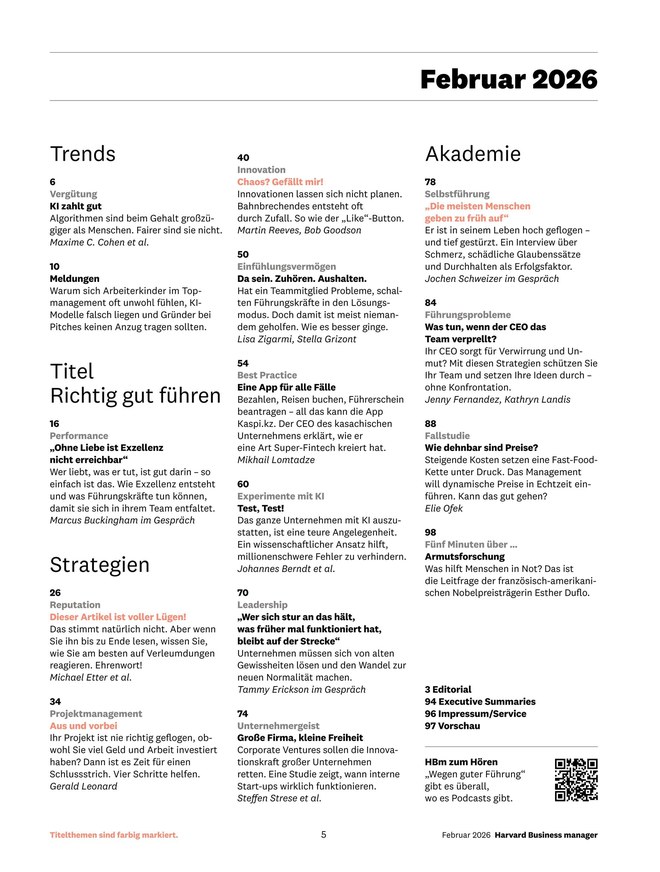 Lesen Sie den Harvard Business Manager als digitale Ausgabe und profitieren Sie von zahlreichen Vorteilen. Einerseits finden Sie alle regulären redaktionellen Inhalte der Printausgabe, andererseits können Sie dank des mobilen Zugriffs jederzeit bequem und ortsungebunden lesen. Im iKiosk finden Sie den Harvard Business Manager als praktisches ePaper oder als PDF zum Download. So haben Sie Ihr Magazin stets auf dem Smartphone oder Tablet abrufbar. Zusätzlich möchten wir Ihnen außerdem auch vorherige Ausgaben der Fachzeitschrift bereitstellen, diese finden Sie in unserem umfangreichen Archiv.