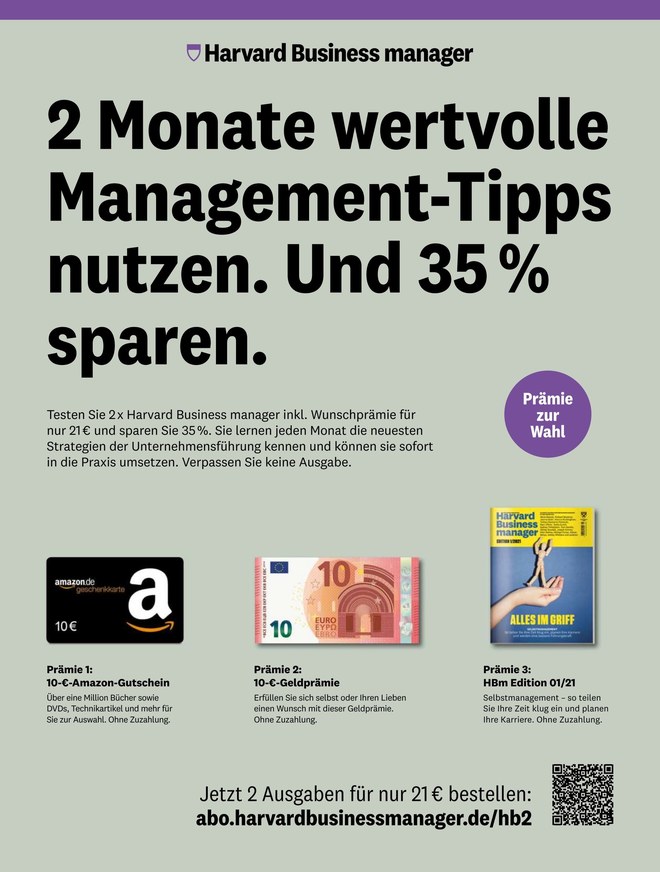 Der Harvard Business Manager ist die Ratgeberzeitschrift für Unternehmensführung, Trends im Management und praxisnahe Optimierungsmaßnahmen. Weiterlesen...