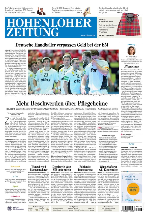 Das E-Paper ist die digitale Ausgabe Ihrer Hohenloher Zeitung und versorgt Sie von Montag bis Samstag zuverlässig mit Nachrichten, Neuigkeiten, Hintergrundgeschichten und Reportagen der Regionen Heilbronn, Hohenlohe und Kraichgau sowie der Welt. Neben den Ressorts Wirtschaft, Kultur, Sport und Region erhalten Sie außerdem fundiert recherchierte Service-Themen und übersichtliche Terminankündigungen.